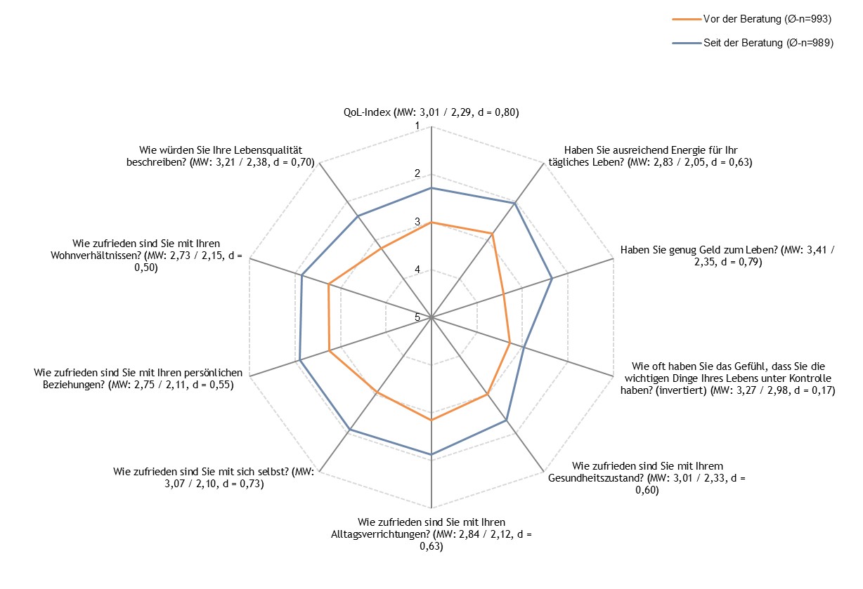 Vergleichende Analysen zeigen eine durchgehend signifikante Verbesserung der Lebensqualität seit Inanspruchnahme der Beratung. Besonders deutlich sind die positiven Effekte beim verfügbaren Einkommen, der allgemeinen Lebenszufriedenheit und dem subjektiven Gesundheitszustand.